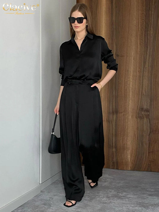 Clacive Fashion Black Wide Trouser Suits Casual Blouse Office Two Piece Set Women